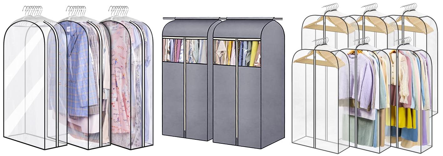 - These large garment bags make your closet look clean and organized. They are a smart way to store suits, coats, and clothes you don’t wear often.