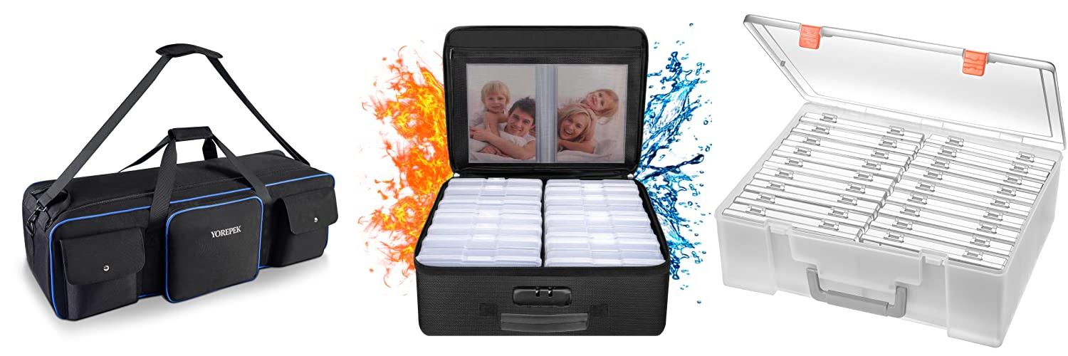 - The large capacity (14.37″ x 10.63″ x 6″) can hold a lot, including up to 1600 4″ x 6″ photos in the included 16 clear inner cases.